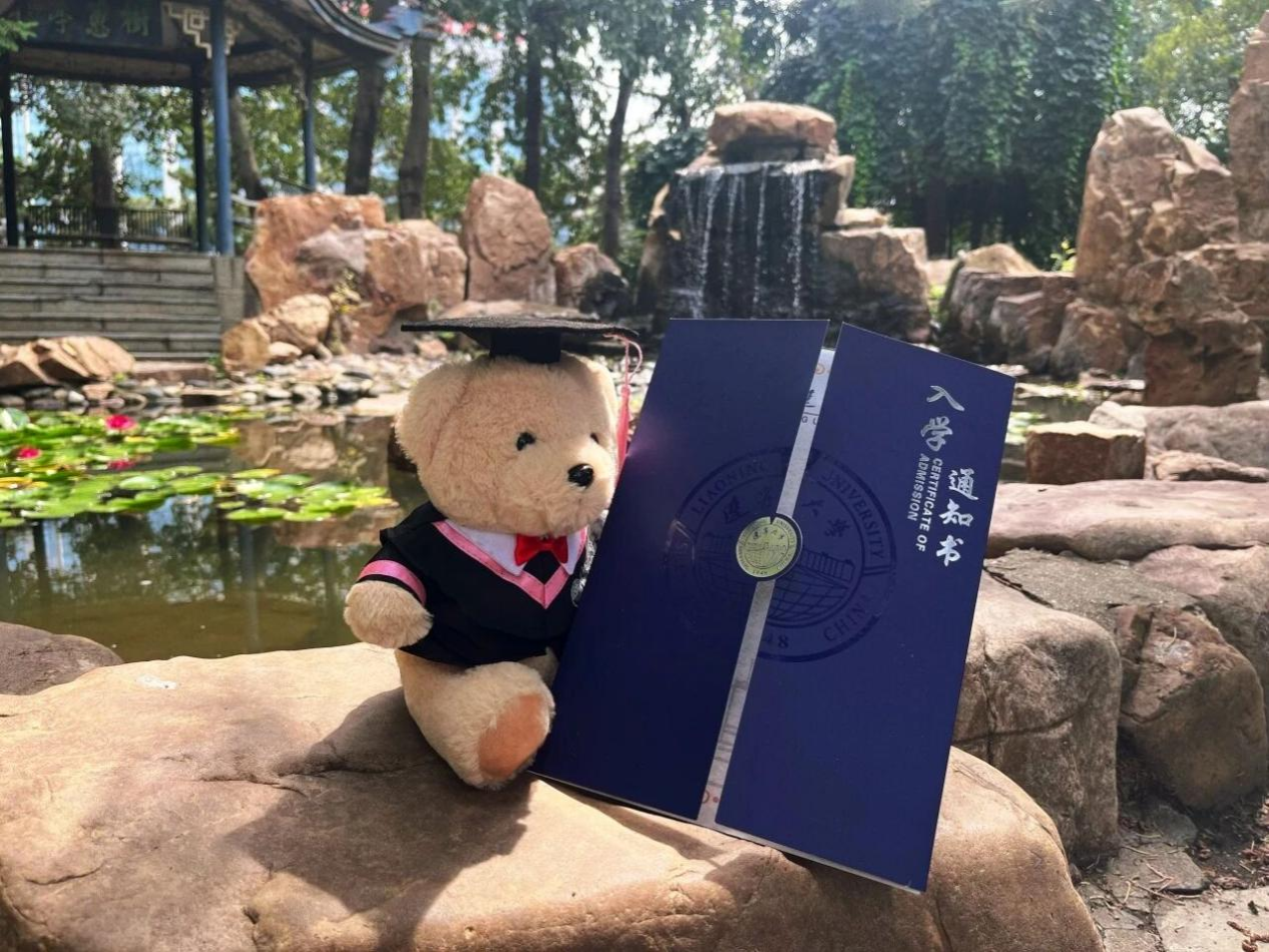 “静下心,听听时光的声音。” 学长熊在静谧的亭中小憩:“这里是偷得浮生半日闲的绝佳去处。清晨诵读、午后静思,或是好友小聚,都别有韵味。入学通知书在这里感受到辽大深厚的文化沉淀,它偷偷告诉我,未来的你,一定会爱上这片宁静。”
