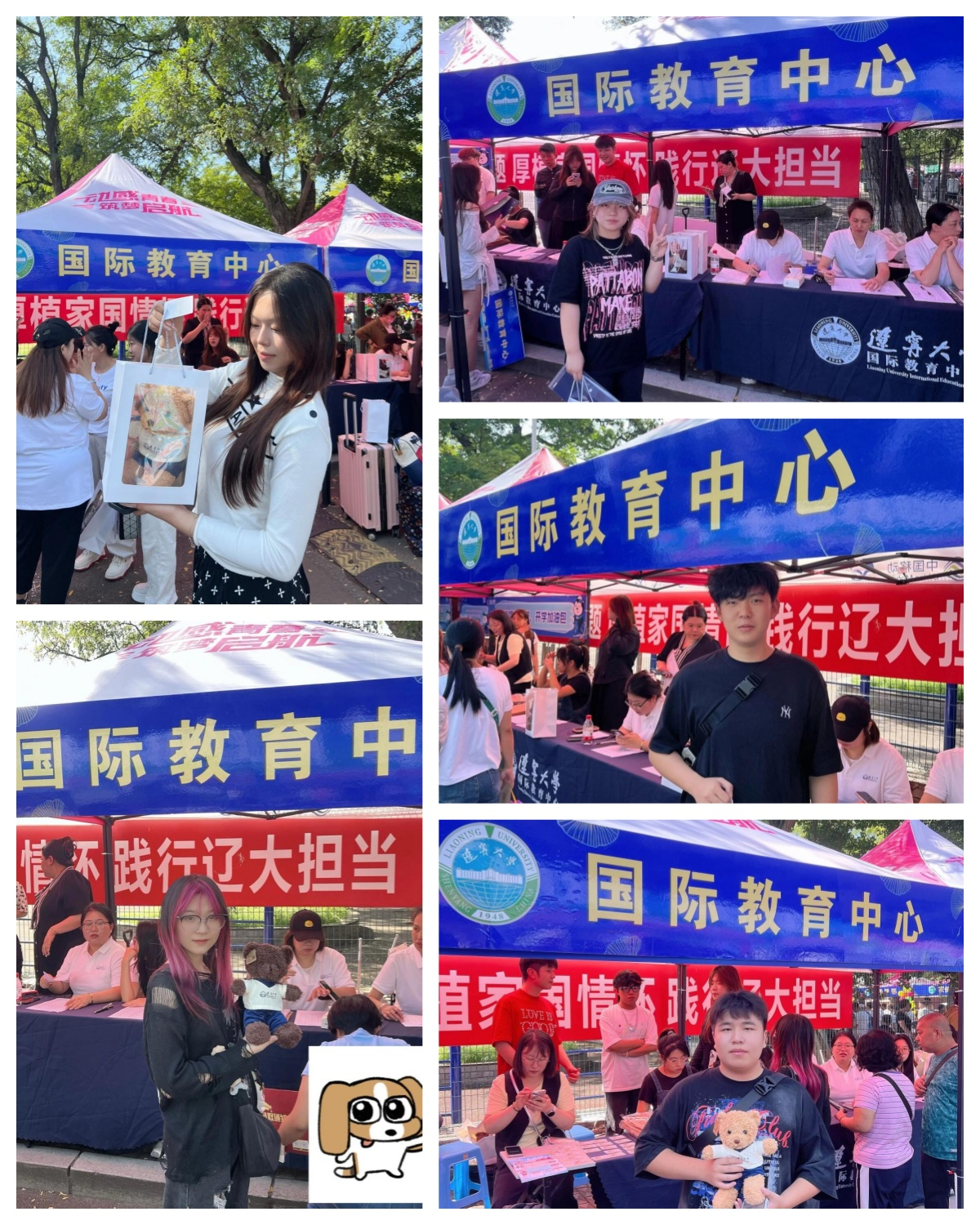 镜头2→ 新生手举礼物俏皮合影,身后是国际教育中心报到处。