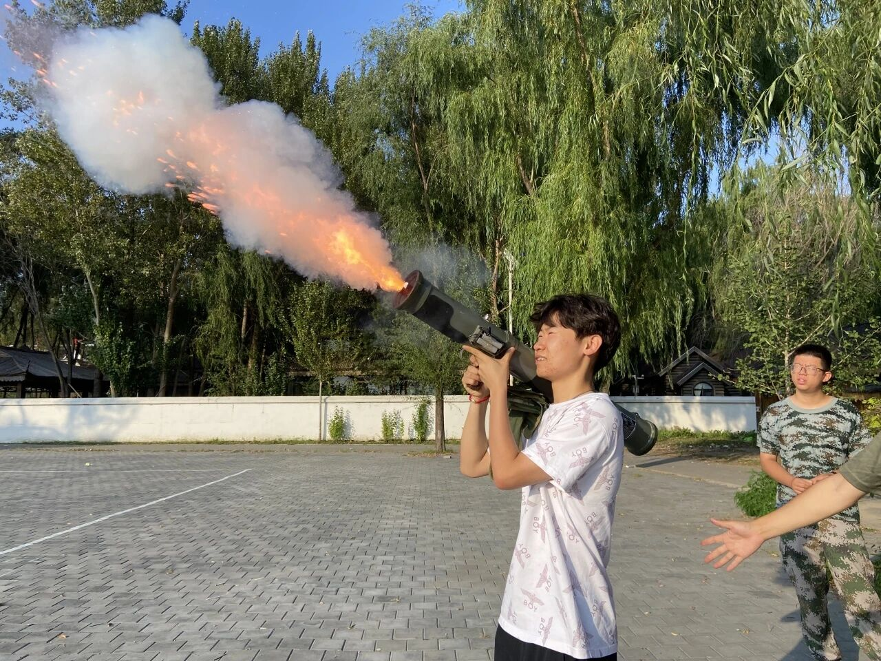 最让人期待的环节来了!同学们来到操场,亲自体验火箭筒操作。扛起“武器”的那一刻,每个人眼中都闪烁着兴奋的光芒。这份难得的体验,让国防教育变得格外生动深刻。