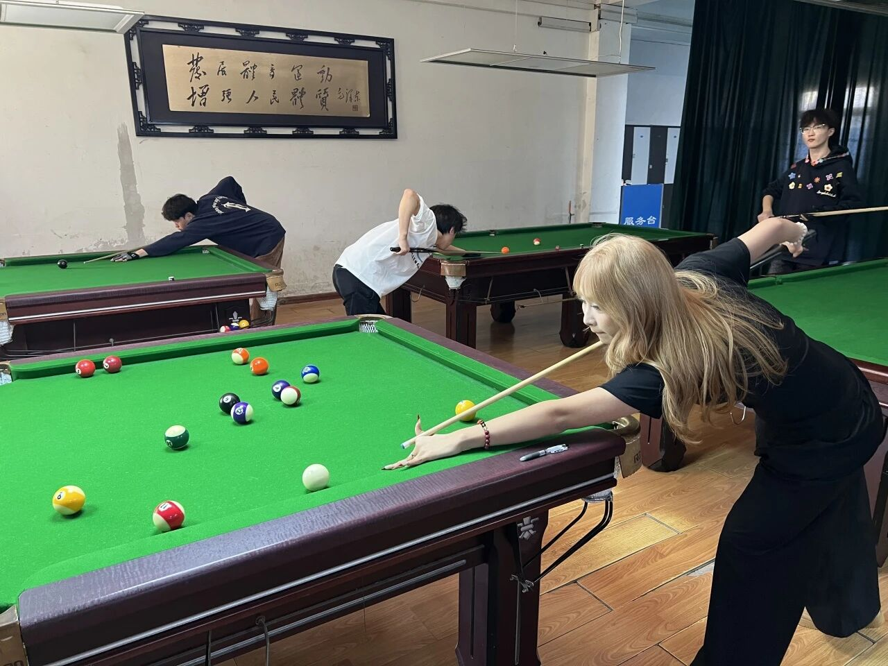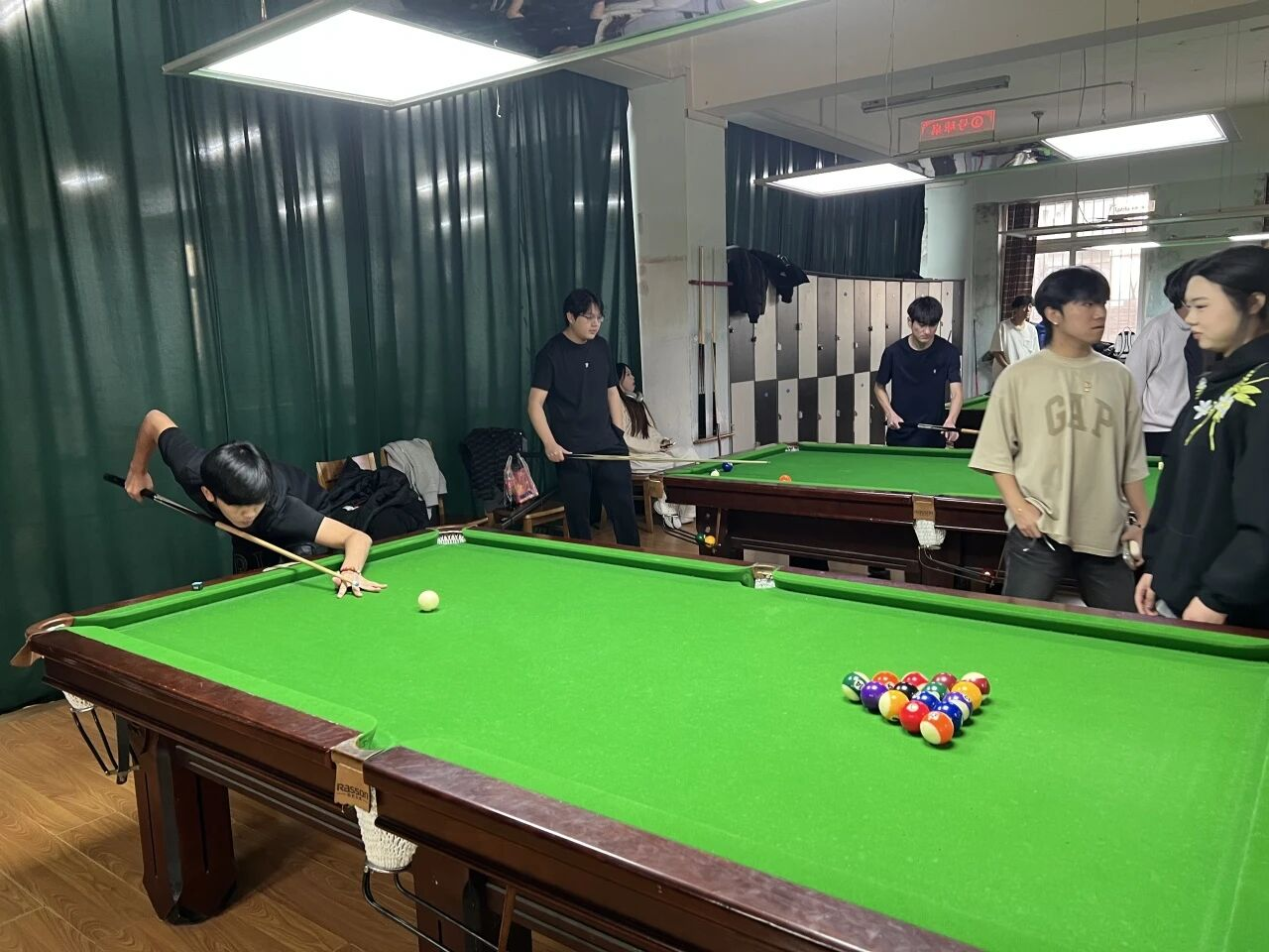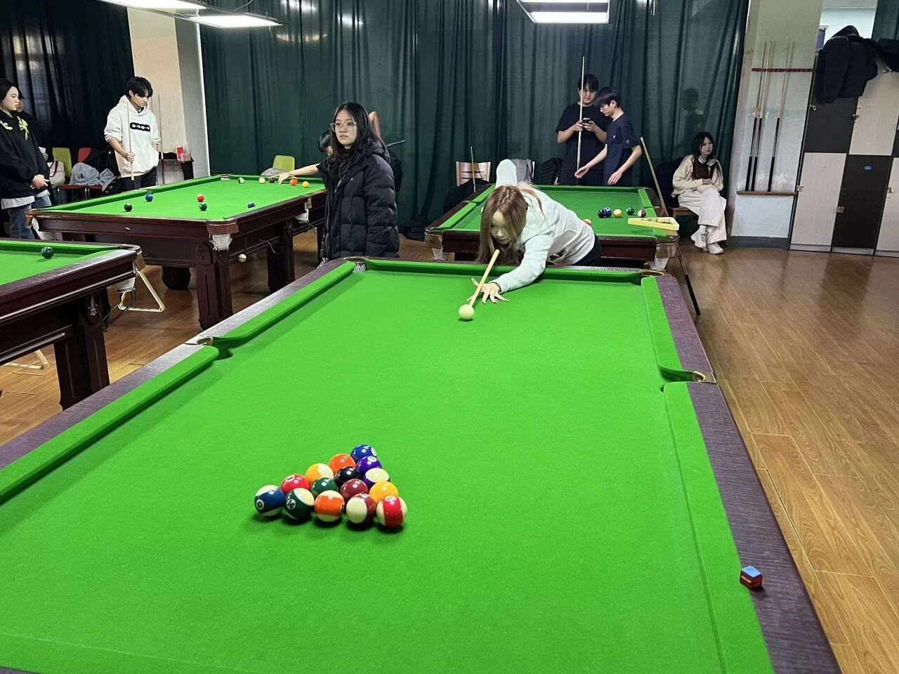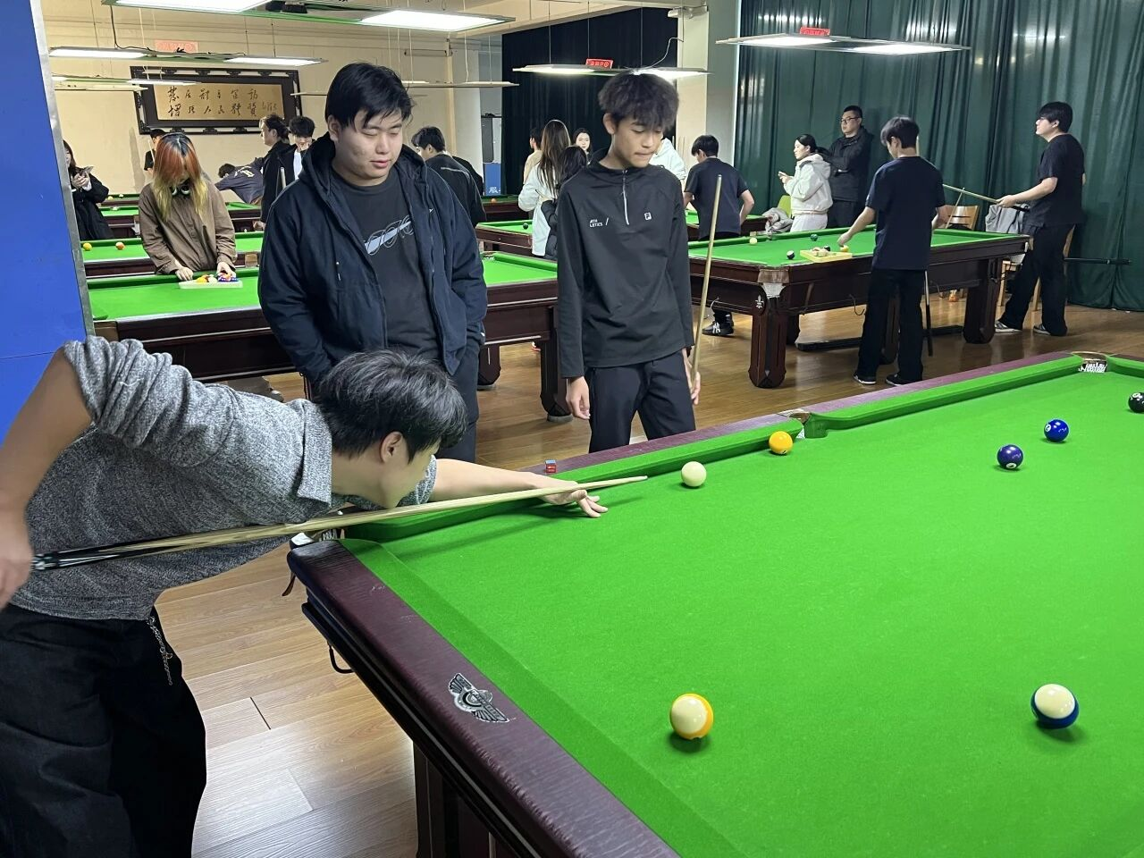 选手们或凝神计算角度,或果断大力击球,白球划出精准的线路,彩球应声落袋的清脆声响,引来观战同学们的阵阵喝彩。每一次精妙的走位,每一杆沉稳的防守,都将赛场气氛推向一个个高潮。